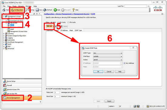 | Stop Interfaces replying to Ping traffic As stated above all firewall interfaces will respond to pings if they are on the network you are connected to. To stop this you use the "icmp" command. Do the same from ASDM Connect to the ASDM > Configuration > Device Management > Management Access > ICMP > Add > Select ICMP type > Interface > Action > OK > Apply > File > Save running configuration to flash.